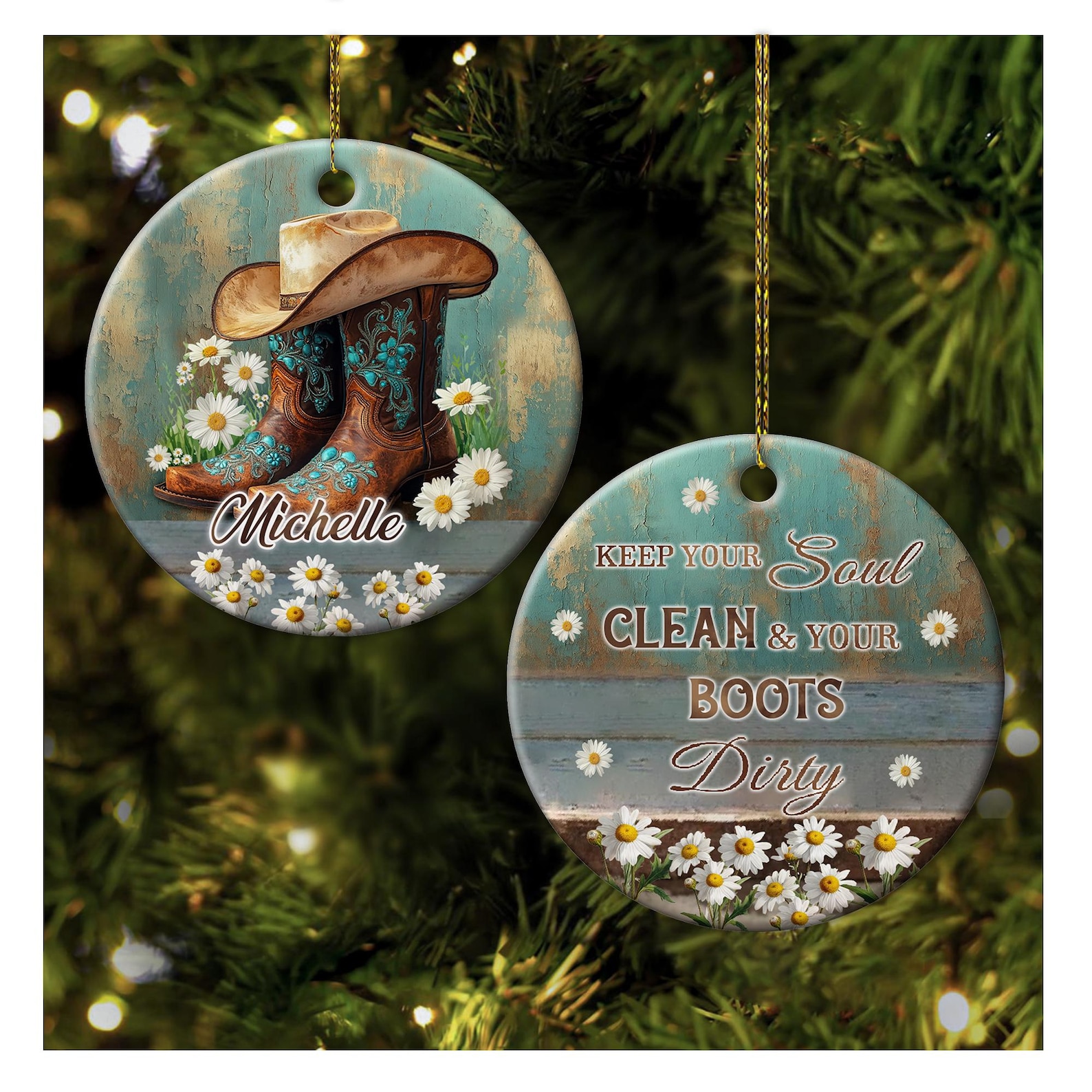 Whimsical Western Theme - Adorned with charming daisies and a rustic background, this ornament captures the essence of Western charm. The phrase "Keep Your Soul Clean & Your Boots Dirty" adds a playful yet meaningful sentiment, resonating with cowboys, cowgirls, and horse lovers alike.