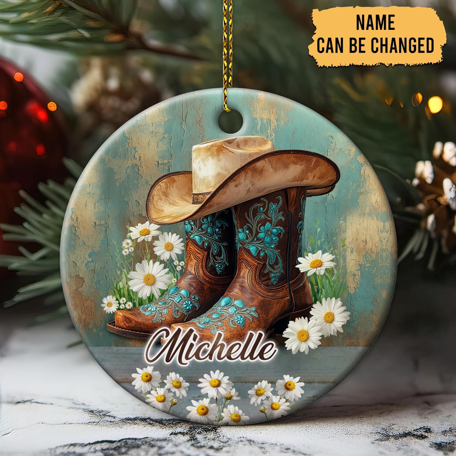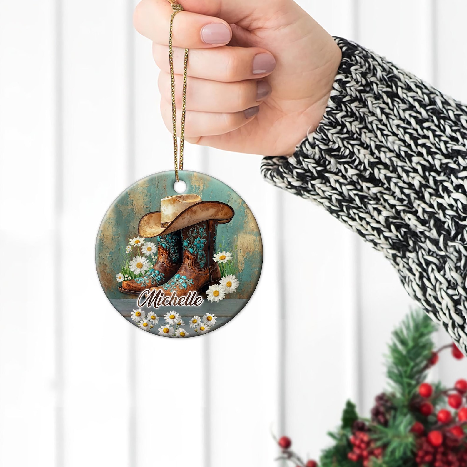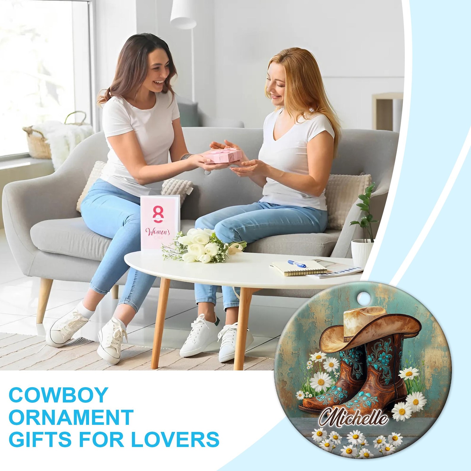 Custom Name Cowboy Boots Christmas Ornament, Ceramic Double-sided Western Tree Hanging Holiday Decor, Christmas Gift for Cowboys/Cowgirls/Horse Lovers