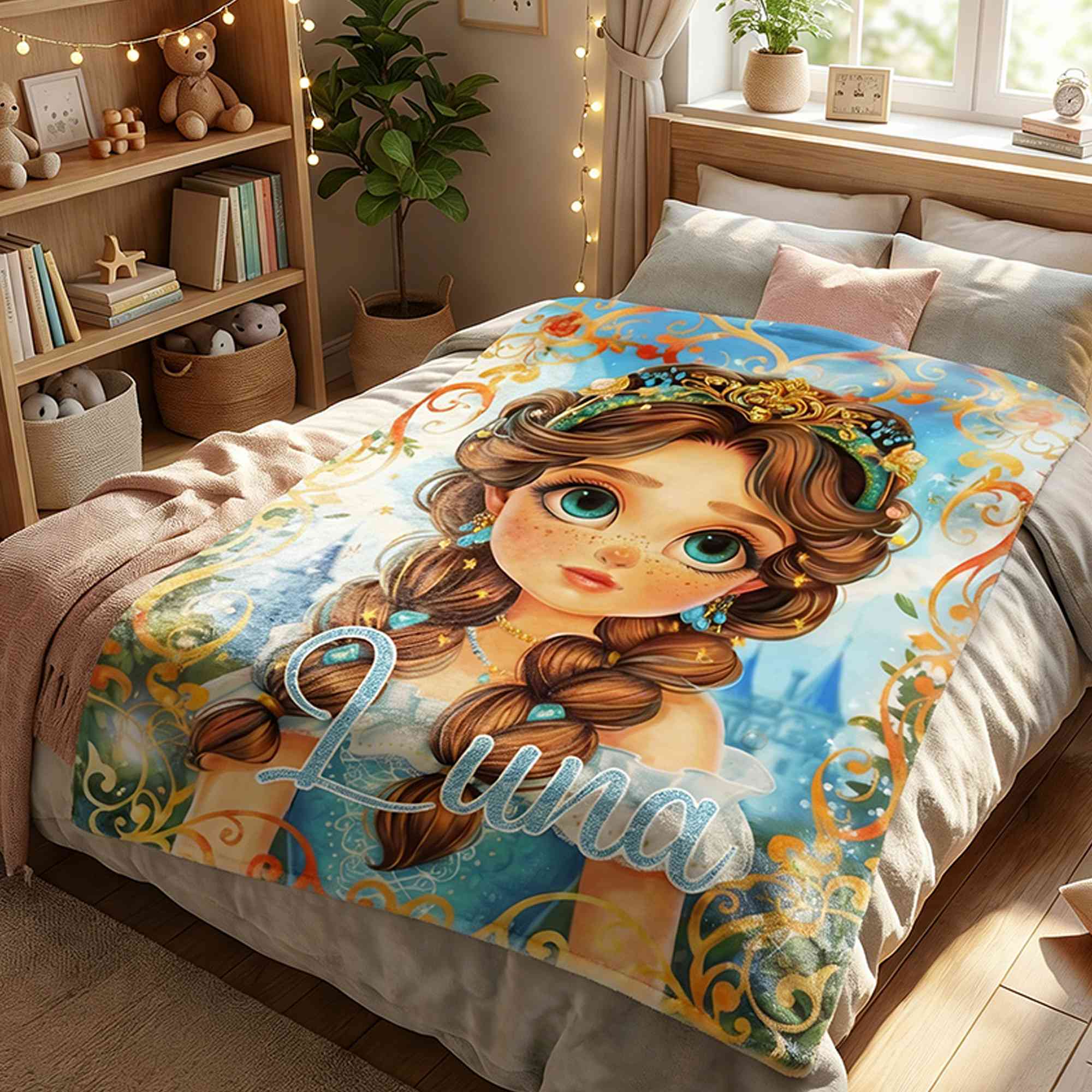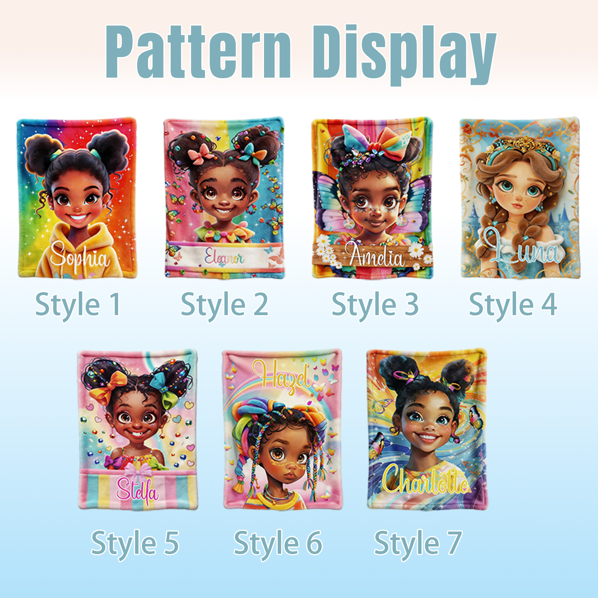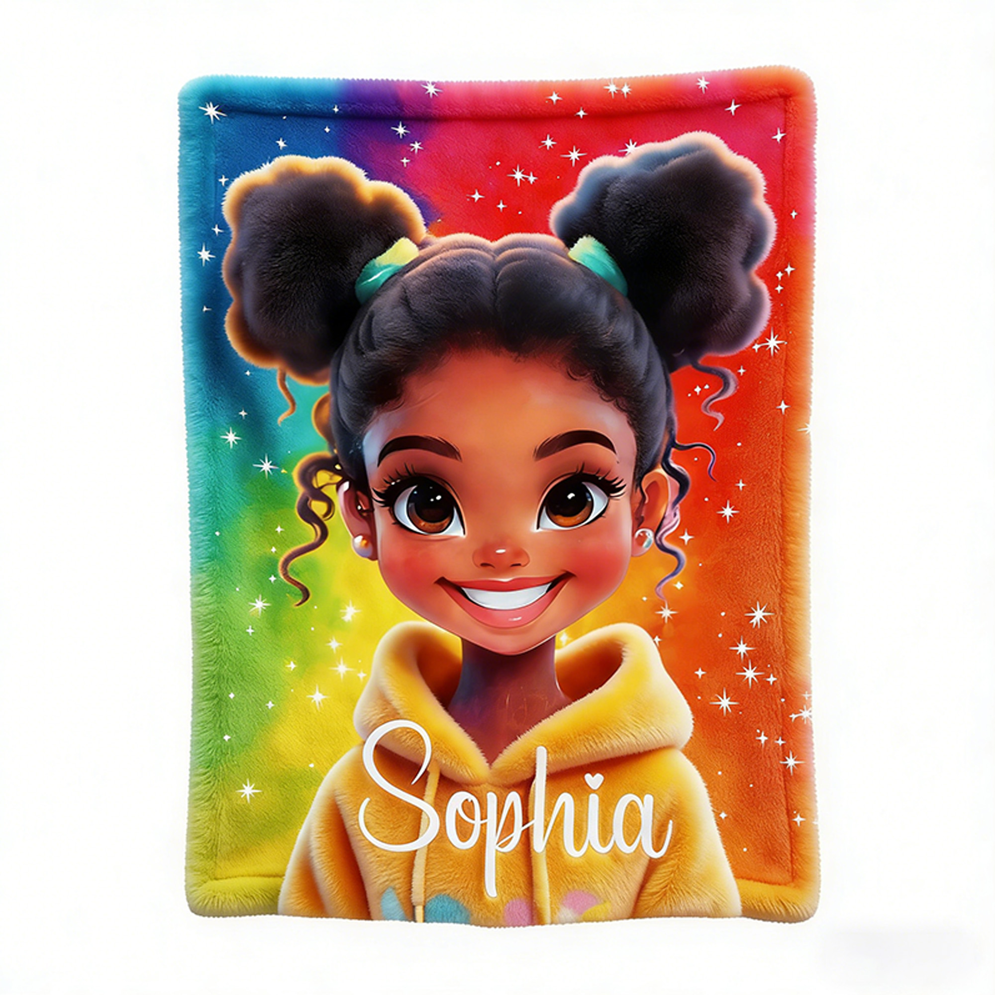 Cartoon Afro Girl Design - The blanket features a cheerful cartoon afro girl illustration that celebrates confidence and culture. The warm colors and playful style add a sweet and cozy touch to any bedroom or sofa, especially for kids who love bright and positive designs.