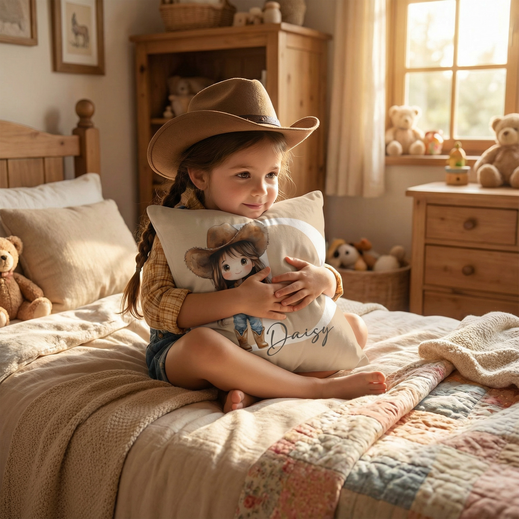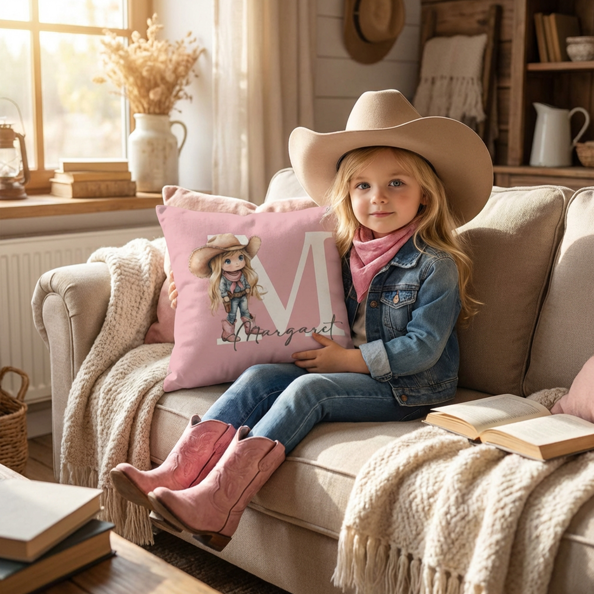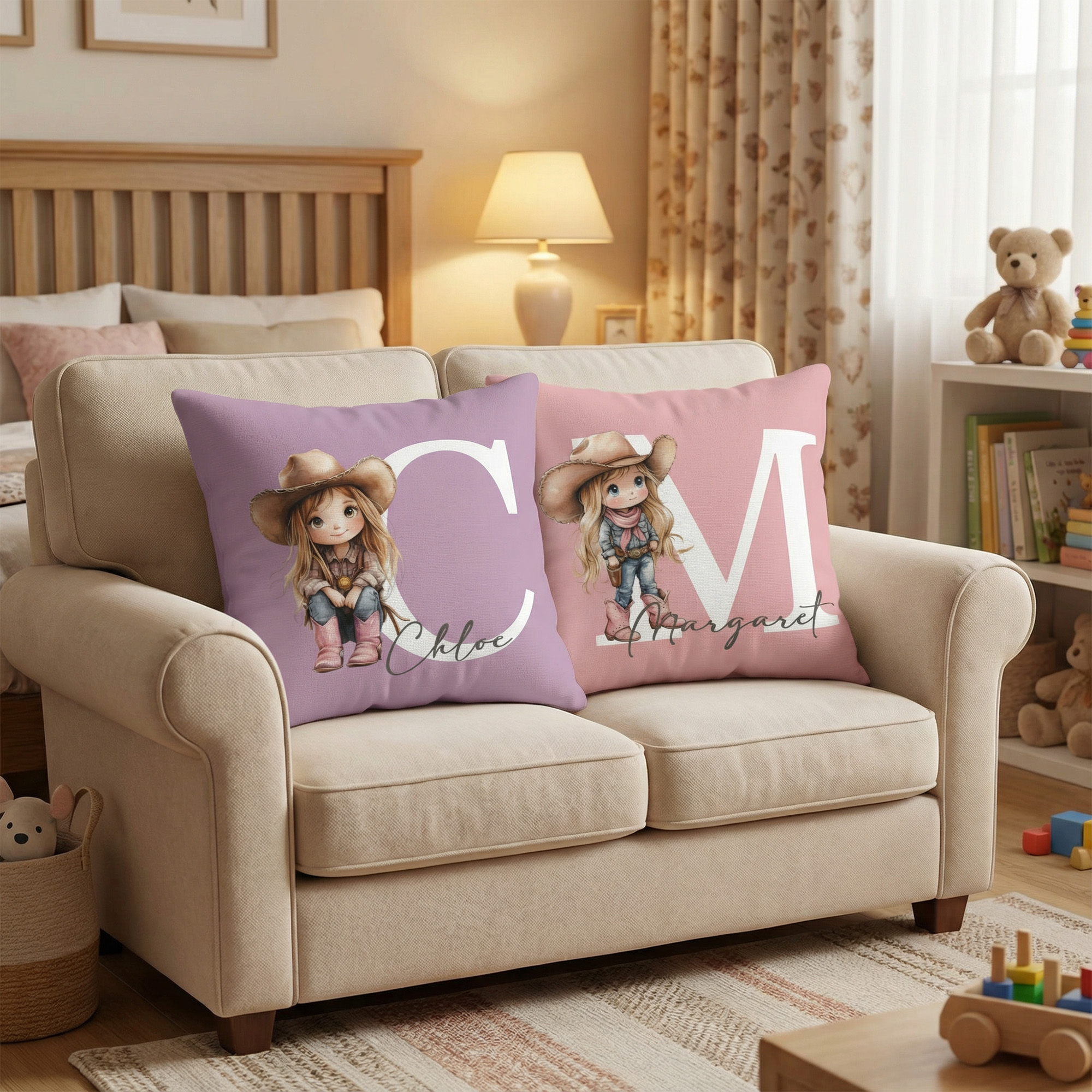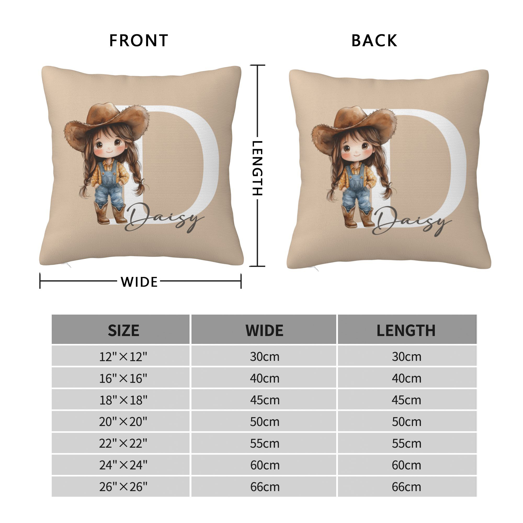 Cowgirl/Cowboy Alphabet Design - This throw pillow cover features a cheerful cartoon cowgirl or cowboy paired with a bold alphabet letter, creating a fun and lively look that adds personality and charm to any kids’ or teenager’s space.